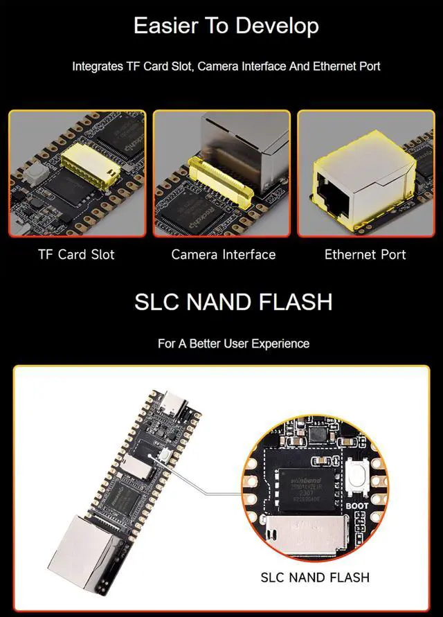 Default Storage: SPI NAND FLASH (128MB) FeaturesHighly integrated and powerful performance, Integrates CPU, NPU, ISP and other processorsSingle-core ARM Cortex-A7 32-bit core with integrated NEON and FPU
