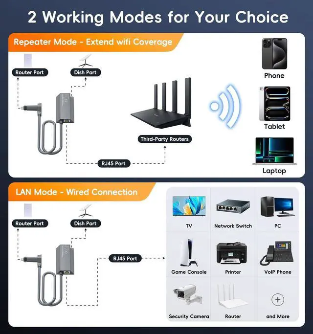 allowing you to easily build a home network, office network and so on, saving you a lot of time and effort. Suitable for users of all technical levels. ^^ Two Working Modes for Your ChoiceThis starlinkg v2 Ethernet adapter has two working modes (repeater mode and LAN mode). For repeater mode, use adapter connecting with a third-party router to extend the network signal coverage to places where the original signal is not good, so that you can connect your mobile phone, tablet computer, and laptop to the Internet freely; for LAN mode, you can use wired connections to TVs, network switches, game consoles, printers, VolP phones, security cameras, routers, etc.
