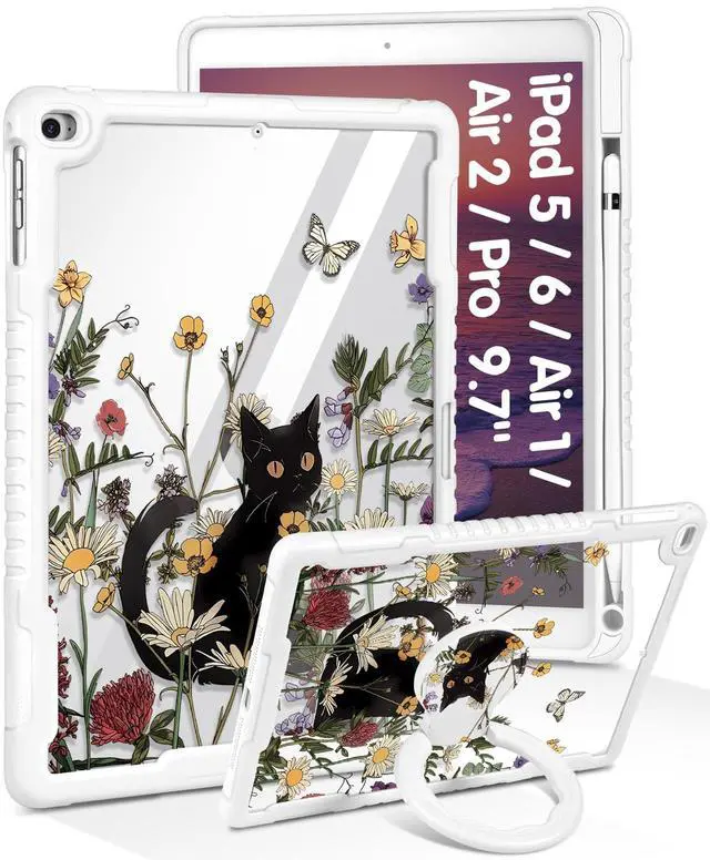 Uppuppy for iPad 5th/6th Gen, Air1/ Air2, Pro 9.7 Inch Case - Women Cute Girls with Stand & Pencil Holder Cover Black Cat Girly Protective Hard Funda for iPad 6/5 Generation, Air 1st/2nd, Pro 9.7