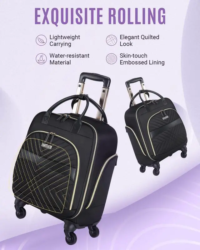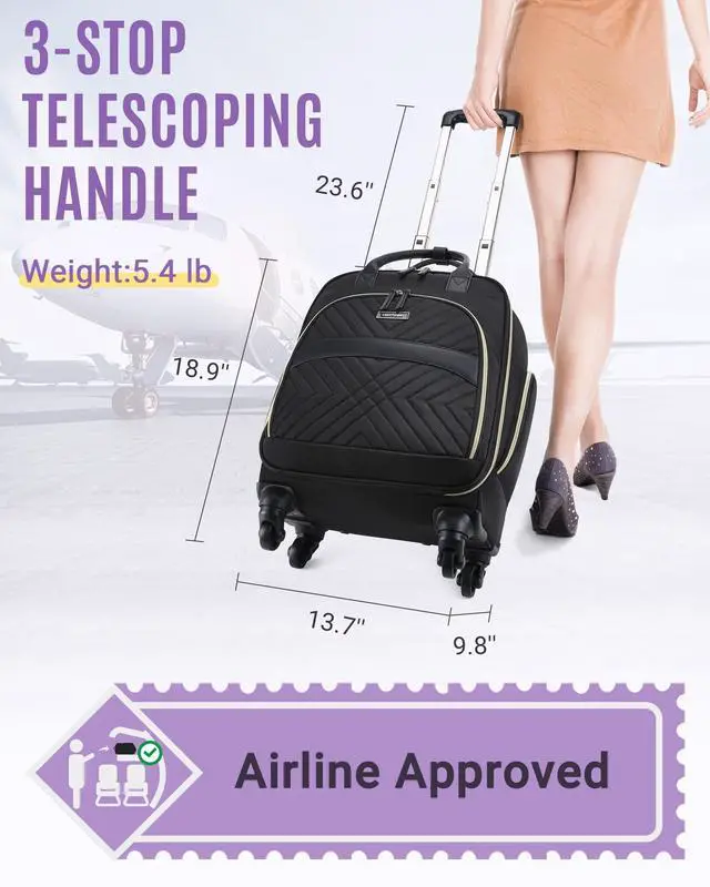 DescriptionLIGHT FLIGHT Rolling Laptop Bag 17.3 inch Rolling Briefcase for Women Computer Bag with Wheels Rolling Laptop Case Water-resistant Overnight Roller Bag for Carry on Travel Work Business, LIGHT FLIGHT rolling laptop bag with wheels is multifunctional in one, suitable for both business and personal travel. Fits easily into most airline overhead bins and meets most airline carry-on size requirements. Comes with separate padded laptop compartment to protect 17.3 inches laptop and store daily supplies, such as A4 folders, textbooks, magazines, laptop charger, keyboard, power bank and office supplies required for work.
