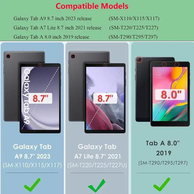Compatibility model: Compatible with Samsung Galaxy Tab A9 8.7 inch (2023 release) (Model number: SM-X110/X115/X117); Compatible with Samsung Galaxy Tab A7 Lite 8.7 inch (2021 release) (Model number: SM-T220/T225/T227); Compatible with Samsung Galaxy Tab A 8.0 inch (2019 release) (Model number: SM-T290/T295/T297); NOT compatible with any other tablet models.