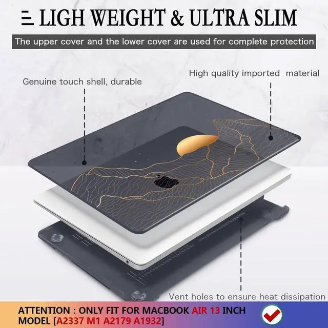 Only Compatible with MacBook Air 13 inch M1 Model A2337/ A2179/ A1932 Release 2018-2021. ^^ Please kindly check the model number "AXXXX" on the back of the laptop before purchase. ^^ NO Cut Out design, comprehensive protection for laptops.
