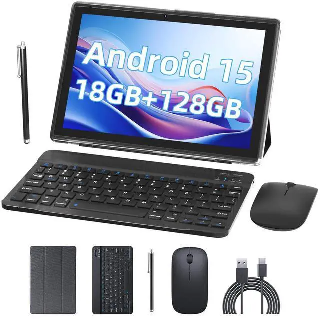 In addition, it can be expanded up to 2TB with a microSD card (card not included) for even more storage. ^^ Portable 2 in 1 Tablet with Keyboard This 10.1 inch android tablet equipped with a bluetooth keyboard, wireless mouse, and stylus as well as a foldable protective case, allowing you to seamlessly transform your 10'' tablet into a laptop-style device. This versatility makes it the ideal device for those who need to be productive on the go, whether it be for work, study, or play. ^^ 10.1 inch Touchscreen & HD Camera The android 15.0 tablet has a 10.1 in IPS display, 1280x800 resolution, a tablet with sensitive screen sensing, equipped with 8MP+2MP dual cameras, narrow edge screen design.