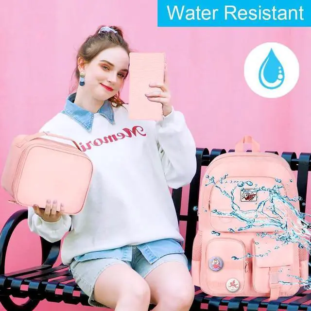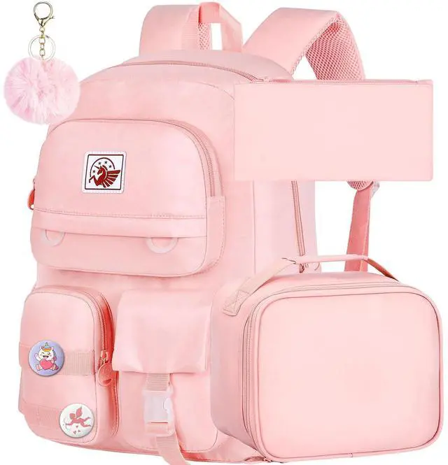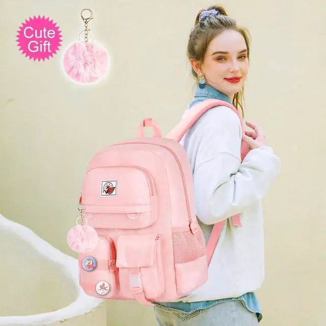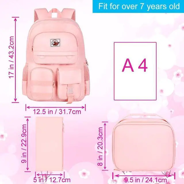 box size: 9" long 5 "high 0.3 "wide. This girls bookbag also comes with two personality badges and a matching color hairball as a gift to make the bag even more stylish and unique. ^^ PREMIUM MATERIALThis school backpack is made of water resistant and soft upgraded materials and high-quality smooth zippers to protect your items from getting wet. (Prevent being soaked by drizzle) This is the perfect Christmas or birthday gift for your daughter, niece, etc. This cute and practical school companion will fascinate your little one. ^^ LARGE CAPACITYThe main compartment of the girl's backpack comes with it is equipped with an elastic band and a soft sponge cushion to prevent sliding. It can also accommodate items such as folders and textbooks. The four pockets in the front can store cell phones, notebooks, keys and other commonly used items. Two elastic side pockets are suitable for umbrellas and water bottles. The Reasonable Distribution Of Multiple Pockets Can Help Children Store Items More Neatly And Develop Good Habits. ^^ Safety and ComfortAdjustable s-shape shoulder straps that are breathable, comfortable and durable allow your child's shoulders and back to be comfortable and free.
