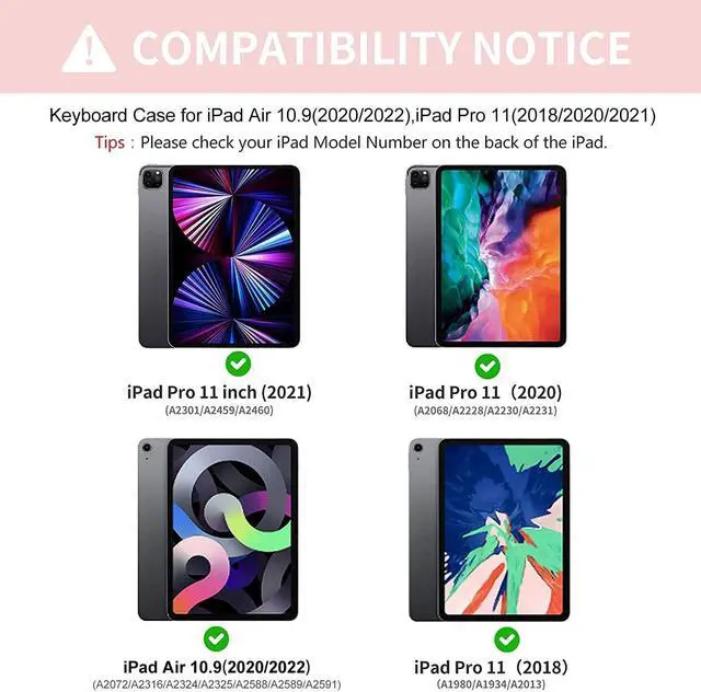 Compatible with iPad Air 10.9 5th Gen/4th Gen/iPad Pro 11 inchCompatible with New iPad Pro 11 inch 4th Generation 2022 (A2435A2761A2762) / iPad Air 10.9 5th 2022 (A2588 A2589 A2591 ) /iPad Pro 11 inch 2021 3nd Generation A2377A2459A2301A2460/ iPad Air 4th Gen 10.9 inch 2020 ( A2316 A2324A2325A2072) / iPad Pro 11 inch 2nd Gen 2020 (A2228 A2068A2230A2231) / iPad Pro 11 inch 1st Gen 2018 ( A1980A2013A1934 A1979). Please check your iPad model before purchasing.