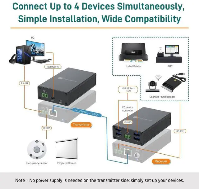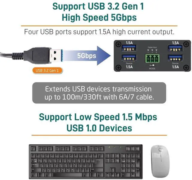 ^^ Delivers 1.5A High Current per PortFour USB 3.2 Gen1 ports support 1.5A high current output, making this extender perfect for high-power USB devices such as USB 3.0 cameras, external hard drives, printers, audio interfaces, and more. Reliable performance without power compromise. ^^ Enhanced Control and FlexibilityEquipped with RS-232 and bi-directional digital I/O ports for comprehensive control of up to four USB peripherals such as printers, cameras, sensors and storage devices. Provides full duplex RS-232 control at 115, 200 bps. Also facilitates remote access and management of digital I/O devices from anywhere, enhancing productivity in diverse environments.