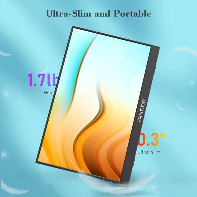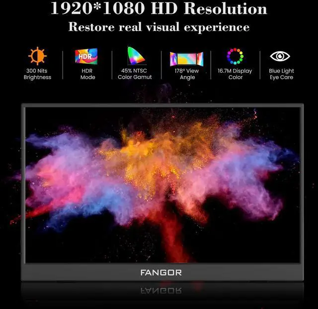 Full HD Portable MonitorThe 15.6-inch Fangor travel portable monitor adopts a 1920 x 1080 resolution IPS screen design, providing a 178 wide viewing angle and a 60HZ refresh rate to restore clearer and more vivid images. It adopts low blue light eye protection technology to effectively relieve visual fatigue caused by long-term viewing.