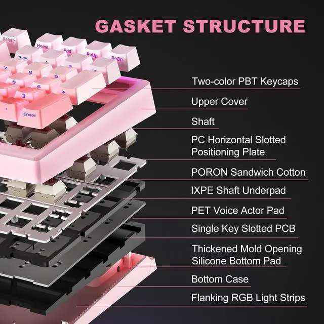 Tri-mode Connection: BT 5.0, 2.4GH z, Type C wired; 2. 16.8 million cool RGB backlight, 16 kinds of lighting modes adjustable, support software custom; 3. Hot swappable pcb keyboard, support 3 pins/5 pins switches; 4. Red linear switches, smooth, quiet, fast; 5. High quality advanced structure, PCB Single Key Slotting; 6. PBT Keycaps; 7. Rechargeable, 5000mAh high capacity battery; 8. 99 key 90% compact layout with numpad