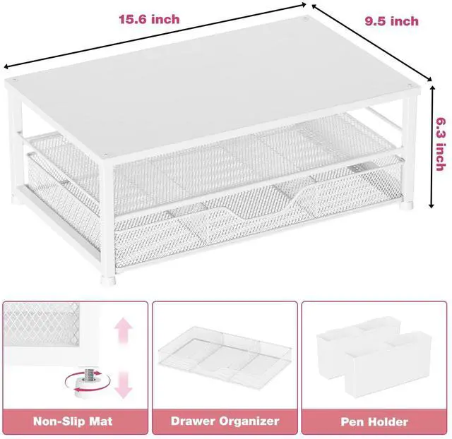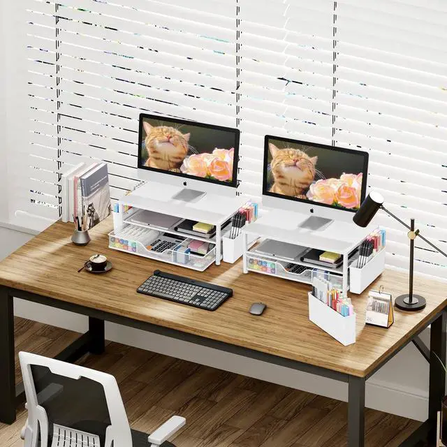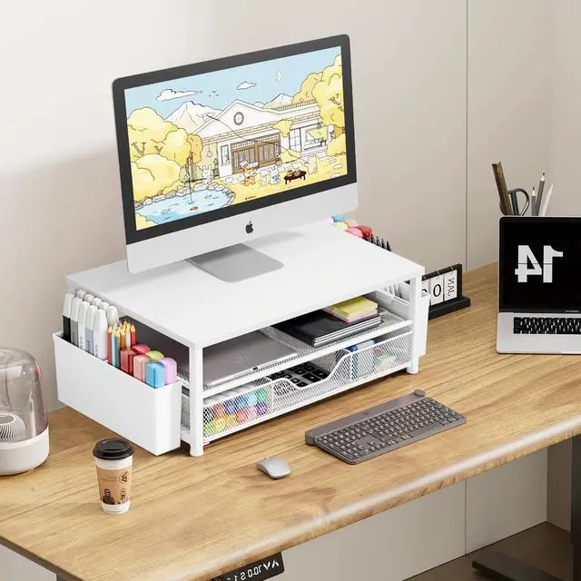 Save SpaceThis 2-Tier monitor stand with drawer and 2 hanging pen holders provides ample storage space to keep your office supplies and office desk accessories neatly organized and easily accessible, keeping your workspace tidy and improving your sense of well-being