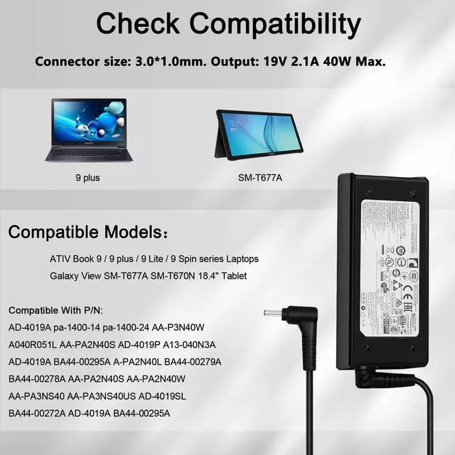Models as blew: JUYOON 40W AC Adapter Compatible with Samsung NP730 NP930 NP730QAA-K01US NP930QAA-K01USJUYOON 40W AC Adapter Compatible with Samsung Galaxy View SM-T677A SM-T670N 18.4" TableJUYOON 40W AC Adapter Compatible with ATIV Book 9 plus NP940X3K NP940X3K-S01US NP940X3K-S02US NP940X3K-K02US NP940X3K-K03USJUYOON 40W AC Adapter Compatible with ATIV Book 9 NP900X3K NP900X3K-S01US NP900X3K-S02USJUYOON 40W AC Adapter Compatible with 940X5J NP940X5J NP940X5J-K01US NP940X5J-K02US NP940X5J-S01US NP940X5J-K02CAJUYOON 40W AC Adapter Compatible with ATIV Book 9 2014 Edition 930X5J NP930X5J NT930X5J 15.6 NP930X5J-S01USJUYOON 40W AC Adapter Compatible with ATIV Book 9 style 910S5J NP910S5J NT910S5J 15.6JUYOON 40W AC Adapter Compatible with ATIV Book 9 Plus ( 13.3" LED QHD+ Touch) NP940X3G-K01 NP940X3G-K01CA NP940X3G-K01US NP940X3G-K02US NP940X3G-K03USJUYOON 40W AC Adapter Compatible with ATIV Book 9 900X3G NP900X3G NT900X3G NP900X3G-S01US NP900X3G-S02USJUYOON 40W AC Adapter Compatible with ATIV Book 9 Spin NP940X3L NP940X3L-K01USJUYOON 40W AC Adapter Compatible with ATIV Book 9 NP900X5L NP900X5L-k02usJUYOON 40W AC Adapter Compatible with ATIV Book 9 NP900X3L NP900X3L-K03US NP900X3L-K04US NP900X3L-k06us NP900X3L-EG2CN NP900X3L-K04CN NP900X3L-K04HK NP900X3L-K06HKJUYOON 40W AC Adapter Compatible with ATIV Book 9 Lite 910S3G NP910S3G NT910S3G 13.3 910S3G-K01 910S3G-K02 NP910S3G-K01 NP910S3G-K02