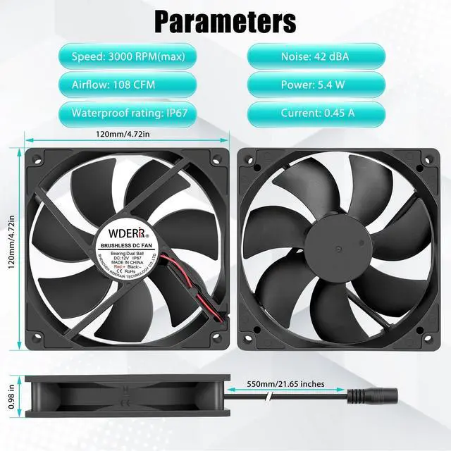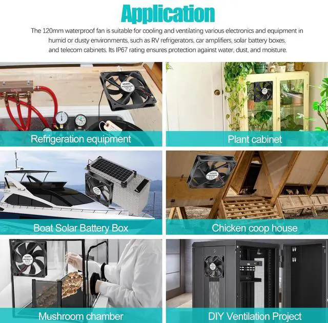 Waterproof FanThe 120mm waterproof fan is suitable for cooling and ventilating various electronics and equipment in humid or dusty environments, such as rv refrigerators, car amplifiers, solar battery boxes, and telecom cabinets. Its IP67 rating ensures protection against water, dust, and moisture. ^^ Small Box FanDIY cooling fan good for electronic equipment window ventilation, muffin fan, server rack, X-box, PS4, receivers, rv refrigerator, kegerator, biltong dryer, corner, humidor circulation, LED, sound system, pc case, greenhouse, grow tent, mushroom or as exhaust box fandehumidifier, terrarium vent, sauna fan.