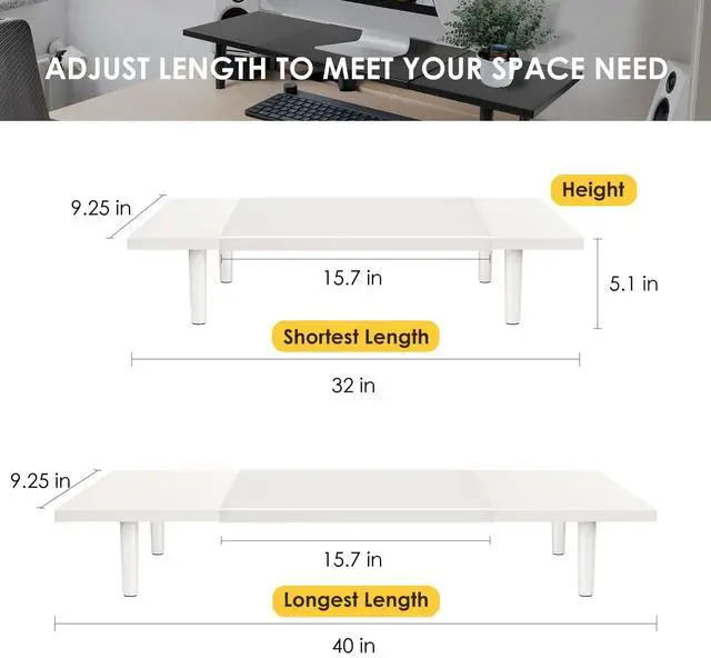 ADJUSTABLE LENGTH MONITOR STAND The length of the dual monitor riser for desk can be retractable from 32 in to 40 inch, you can flexibly adjust length according to the space and the different size of screen. You could adjust to the short length when you only need single monitor to save space. Adjusting to the long length if you need multiple computers to work at the same time. ^^ GET A TIDY WORKING SPACEThe space underneath of computer stand for dual monitor can easily fit a full-size keyboard and other office stuff to free up valuable desk space.