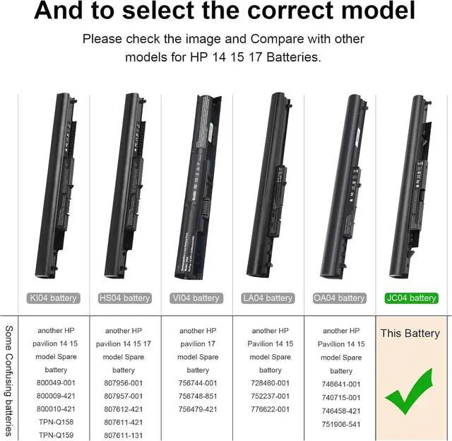 Voltage: 14.8V. The battery is durable and has overcurrent protection, anti-overcharge, anti-overdischarge and temperature control functions. ^^ Compatible Part Number919681-221 919682-121 919682-421 919682-831 919700-850 919701-850 HSTNN-DB8E HSTNN-H7BX HSTNN-L67N HSTNN- PB6Y 2LP34AA HSTNN-DB8E JC03 JC04 TPN-C129 TPN-C130 TPN-Q186 TPN-Q187 TPN-W129 TPN-W130 ^^ This laptop Battery works with HP 15-bs000 Series 15-bs168cl 15-bs010ds 15-bs013dx 15-bs060wm 15-bs192od 15-bs033cl 15-bs095ms 15- bs015dx 15-bs020wm 15-bs016dx 15-bs038dx 15-bs078cl 15-bs060wm 15-bs013nr 15-bs077nr 15-bs053od 15-bs091ms 15-bs080wm 15-bs053od 15-bs131nr 15-bs023cy 15-bs016dx 15-bs038cl 15-bs058ca 15-bs065nr 15-bs091ms 15-bs091ms 15-bs132nr 15-bs008cy 15-bs011cy 15- bs132nr; HP 15-bw000 Series 15-bw010nr 15-bw032wm 15-bw033wm 15-bw011dx 15-bw070nr 15-bw028ca 15-bw036nr 15-bw05 ^^ Security & ReliabilityOur batteries are assembled from top quality material and circuit boards to ensure fast charges and low power consumption, 100% New from Manufacturer, Overcharge and Overdischarge Circuit Protection, Over-temperature and Short-circuit Protection, up to 500 recharge cycles over the life of the battery, meet OEM standard. ^^ SupportFull refund in 30 days, 12 months warranty. If any issues about the product within 365 days, click the button "ASK A QUESTION" and CONTACT US, we will respond within 24 hours via emails and give you friendly after-sales service. Press [CTRL + F] to search your laptop model/part number.
