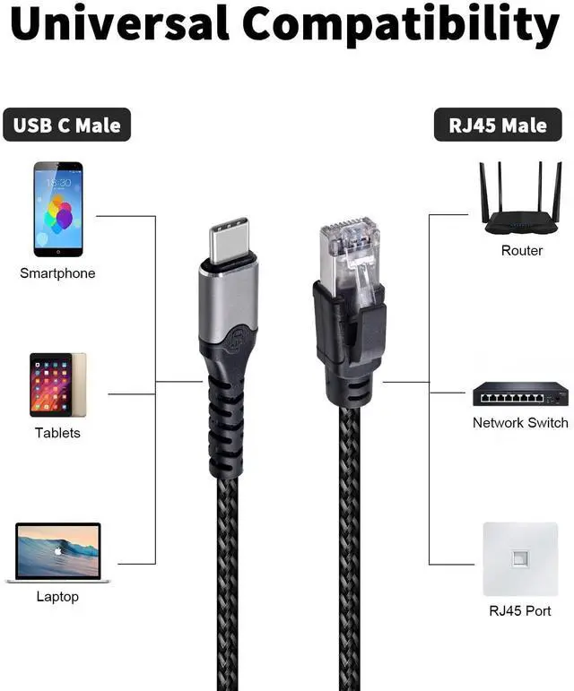 ^^ Wide Compatibility: This RJ45 to USB C cable serves as a powerful communication bridge between your laptop, tablet, or smartphone and Ethernet networks. It's compatible with MacBook Pro, MacBook Air, Dell XPS, Mac, iPad Pro, iPhone 15 series, Galaxy S24, Google Pixelbook, Surface Book, and other laptops, tablets, and smartphones with a Type-C port ^^ This is a compact nylon ethernet cable to usb c with a length of 10FT, allowing you to use it without worrying about distance limitations. It doesn't take up much space and wont put too much pressure on the USB C port. Whether for streaming, gaming, or working from home, this cable provides excellent speed and reliability, making it an essential accessory for anyone looking to enhance their wired internet connection ^^ Ethernet to usb c