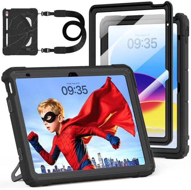 Case for iPad A16 11th Generation 11 Inch 2025, Auorld for iPad 10th Generation 10.9 inch 2022 case Kids Boys with Screen Protector Foldable Stand Shoulder Strap Pencil Holder Shockproof, Black Black