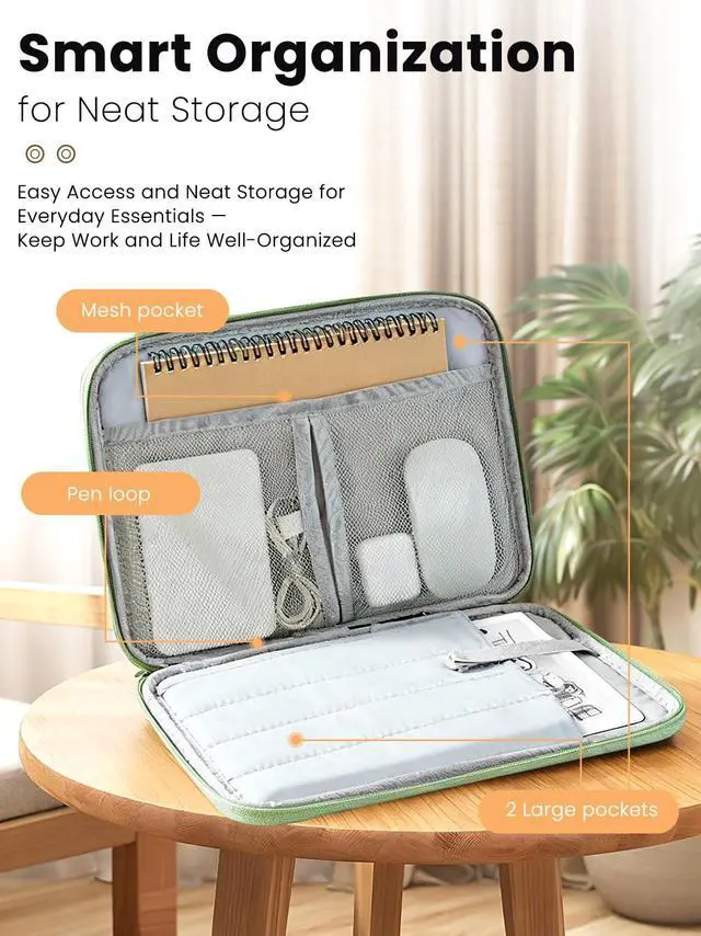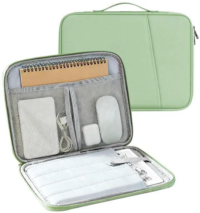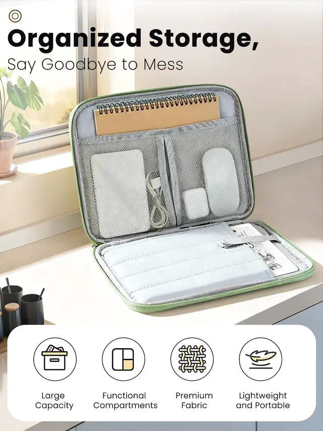 1. Ample Storage, Stay OrganizedTwo large pockets and a mesh pocket keep your tablet, charger, and accessories neatly arranged. 2. Smart Multi-Purpose DesignIncludes a pen loop perfect for business, school, or daily use. 3. Reliable Shock ProtectionSoft padded lining absorbs impact and prevents scratches or drops. 4. Lightweight and Easy to CarryComes with a handle for effortless portability ideal for commuting or travel. 5. Water-Repellent and Durable FabricMade from wear-resistant, water-repellent material that stays clean and lasts longer.