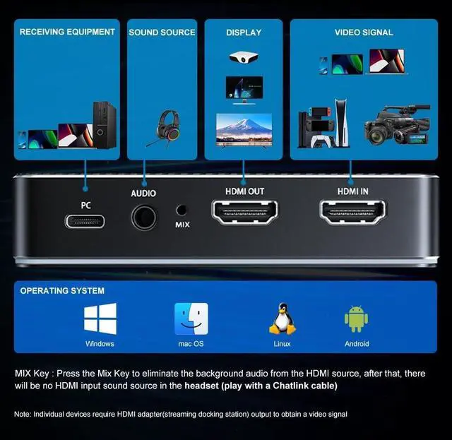 Stream to any Platform: OBS, Streamlabs, Vmix, Zoom, Microsoft Teams, Stream to YouTube, Twitch, Facebook Gaming and more. It 0.39 in size, about 8.8 oz easy to carry, Working with colorful RGB working lights, Enhance the atmosphere of the streaming. ^^ [Low Latency & Zero Delay]Optimized the delay of signal source to OBS acquisition from USB to PC about 60ms, reducing the discomfort of unsynchronized audio picture. HDMI pass-through, the video input signal, Zero loss, Zero delay, output to the display screen, let the game is always synchronized wonderful. ^^ [Mute Button (MIX) ]Press the Mix Key to eliminate the background audio from the HDMI source, after that, there will be no HDMI input sound source in the headset (play with a Chatlink cable) However, it has no effect on the audio source capture and recording of OBS, it only blocks the HDMI audio source in your headset.
