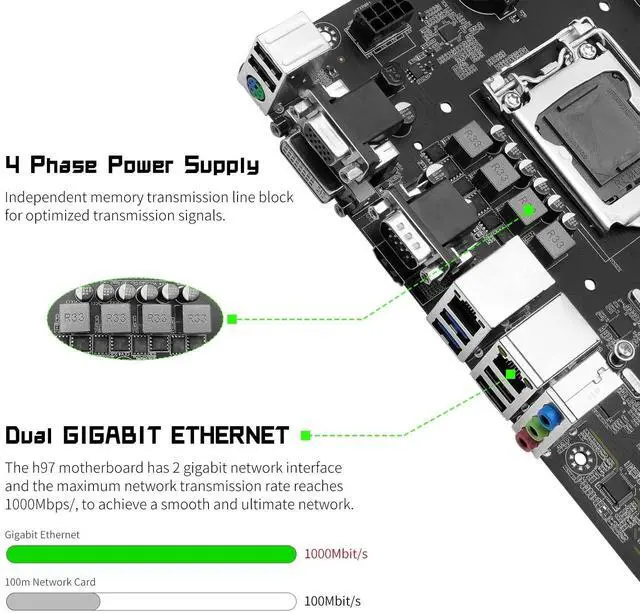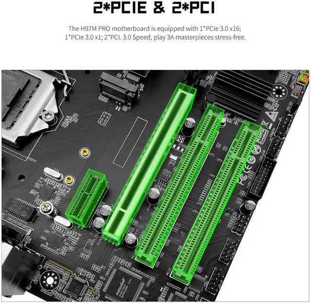 Performance Motherboard: The lga 1150 DDR3 motherboard is equipped with H97 chipset. And with Heat dissipation armor protection for strong heat dissipation, to ensure stable bus communication ^^