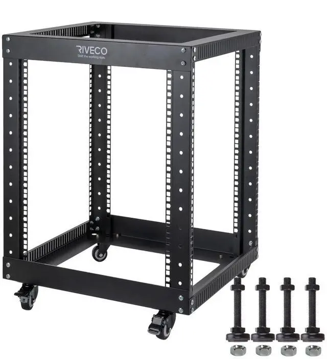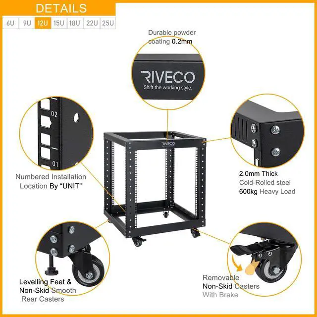 STURDY: 4-post construction, heavy-duty, SPCC cold-rolled steel can safely support up to 600 lbs of rack mounting equipment with leveling feet, and 500 lbs with casters. The black RAL9005 powder coat finish makes this 12u rack resistant to scratching and rusting ^^
