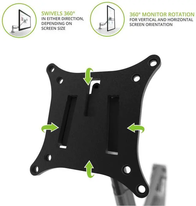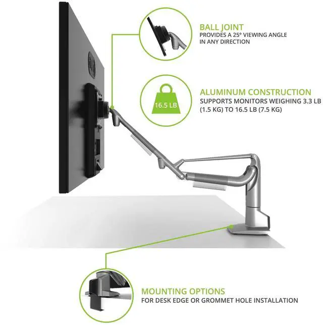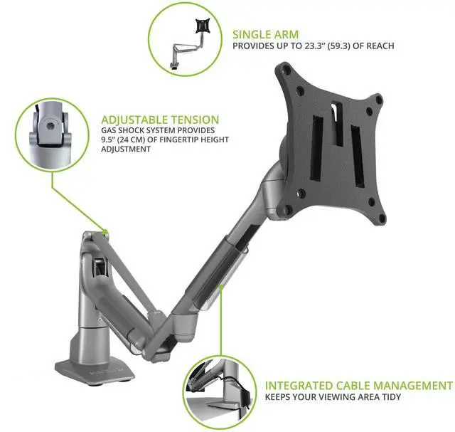 EASY INSTALLATION - The detachable base can be secured entirely from the top of your desk. ^^ GAS SHOCK SYSTEM - Freely raise or lower your screen to improve line-of-sight and reduce neck strain. ^^ UNLIMITED POSITIONS - Easily swivel, tilt and rotate your monitor for optimal viewing. ^^ WIDE RANGE OF SUPPORT - Fits any desk edge or grommet hole up to 2" thick and supports monitors weighing 3.3 to 16.5 lb. ^^ CABLE MANAGEMENT - Conveniently route your cables to ensure a clean setup.