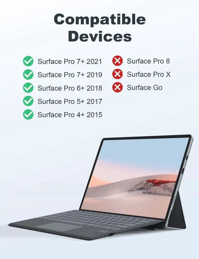 Premium Surface Pro Keyboard Our magnetic bluetooth keyboards can be used attached or detached and the keys provide a more natural typing experience like a real laptop. This keyboard is suitable for Surface 12.3 -inch Pro 7, Pro 6, Pro 5, Pro 4, Pro 3 ^^ LED Backlit Color Options This typing keyboard cover features seven brilliant colors with adjustable brightness to help you type in any indoor or outdoor lighting. ^^ Portable, Business-Ready Design Maximize school or work productivity with a slim Surface type cover that protects the screen and offers responsive keystrokes.