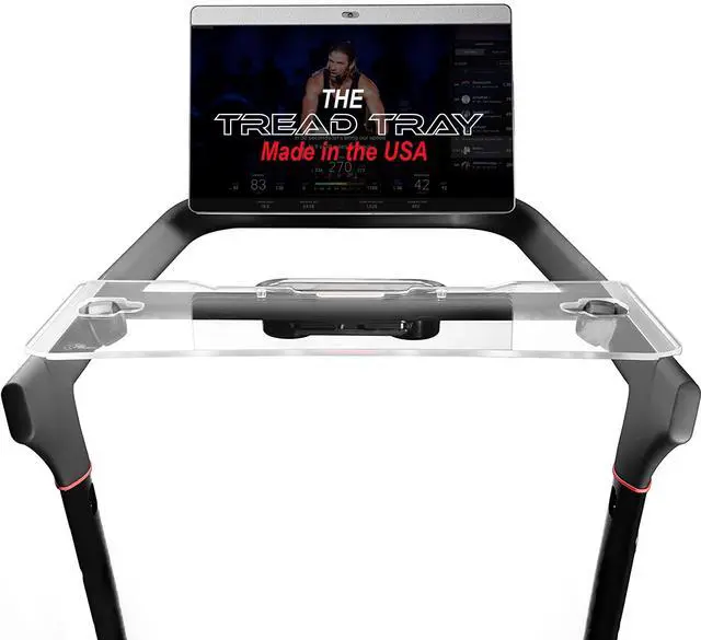 The Tread Tray 2.0: Kick your productivity into high gear! Compatible with Peloton Tread. (Smaller treadmill, DOES NOT FIT TREAD PLUS) The Tread Tray 2.0 by TFD seamlessly turns your compatible treadmill into a functional dual-purpose workstationwork, meet, read, or watch TV while you walk or jog. This supportive acrylic tray table fits onto your handlebar and is the perfect laptop tray or holder for your tablet, phone, books, and more. * DOES NOT SUPPORT PELOTON TREAD+ ^^