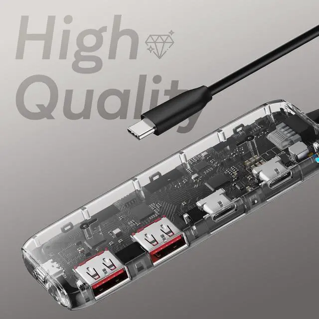 ^^ NOTE: (1). The 4 USB-C ports only supports data transmission, do not support video output or charging to peripherals. (2). The PD charging port of the hub is configured as PD 3.0 protocol. Please be sure to use devices with PD 3.0 protocol. If the connected device is PD 2.0 protocol, the other USB ports of the hub will be disconnected for a few seconds and then restarted. This is normal and not a product problem.
