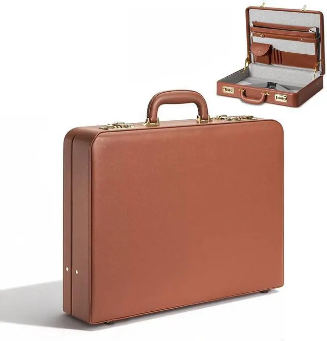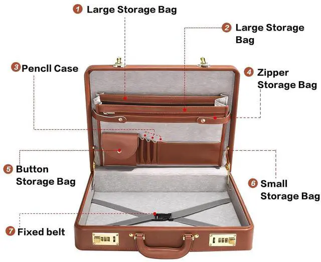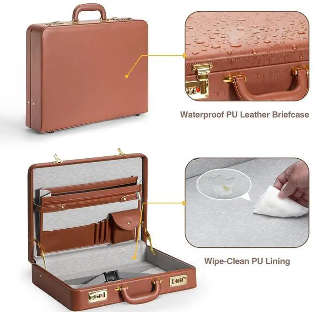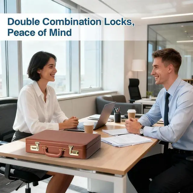 Spacious & Organized Storage Stay organized on the go! This lockable briefcase includes six compartments: a laptop pocket, zippered storage, pen bag, and dedicated spaces for phone and documents, making it perfect for professionals ^^ Secure Dual Combination Lock Designed with enhanced security, this storage lock box features dual combination locks to keep your important items safe from unauthorized access, ensuring peace of mind during travel or office use ^^ Sleek & Durable PU Leather The LOCKCURX men's briefcase is made with premium PU leather, offering a sophisticated vintage design in brown. Its durable, hard exterior provides a polished look and long-lasting protection for your business essentials ^^ Easy to Clean & Low Maintenance The briefcase with lock is made with PU leather on both the interior and exterior, making it easy to maintain. Simply wipe away dust or dirt with a damp cloth to keep it looking like new, ensuring minimal upkee ^^ Ideal for Business, Travel & Gifting This versatile locking trunk keeps your essentials secure and organized, whether you're commuting, traveling, or attending meetings. Its sleek design makes it a perfect gift for professionals