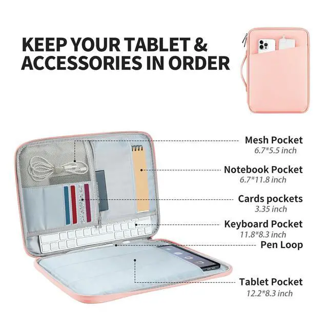 Organized Storage: Ample space to store your iPad/Tablet/Keyboard and organize your accessories. Keep chargers, cords, earbuds, and more in one place ^^ Lightweight and