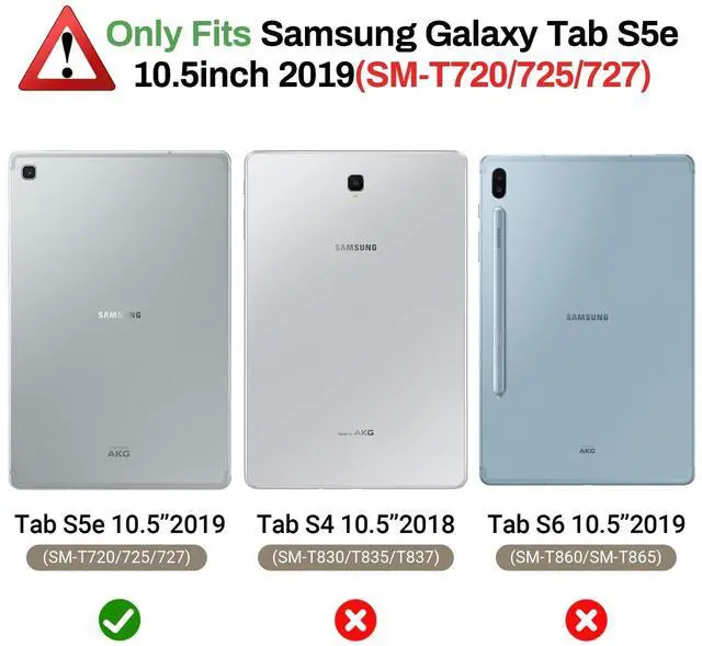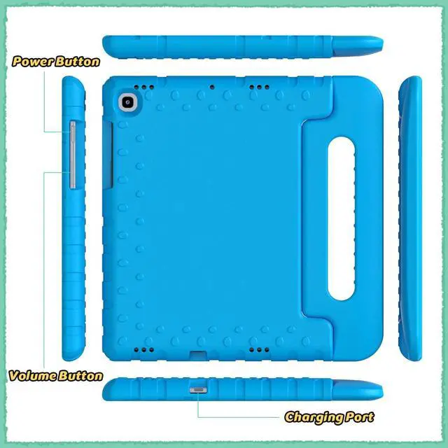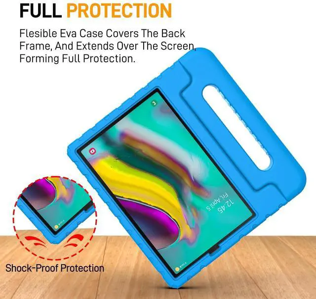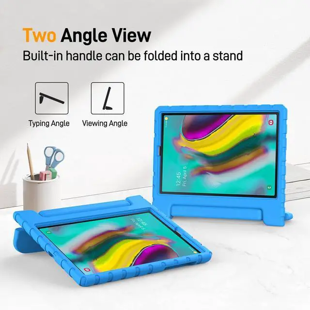 [Compatibility] Protective shock absorption kids case cover specifically designed for Samsung Galaxy Tab S5e 10.5 Inch 2019 Release Model (SM-T720/SM-T725//SM-T727). NOT compatible with other models. ^^ [Kid-friendly Material] Constructed from impact-resistant EVA material, drop protection and impact-resistance safeguarding your device beyond normal wear and tear ^^ [Precise Cut-Outs] All ports and controls (ports, buttons, speakers, etc. ) can be accessed quickly and easily ^^ [Portable Handle Design] The handle can be folded, as a sturdy stand with double angles for convenient viewing, typing, learning and entertainment on the go ^^ [Strong Corner Protection] Lightweight and soft EVA can prevent the tablet from accidental drops, bumps and scratches.