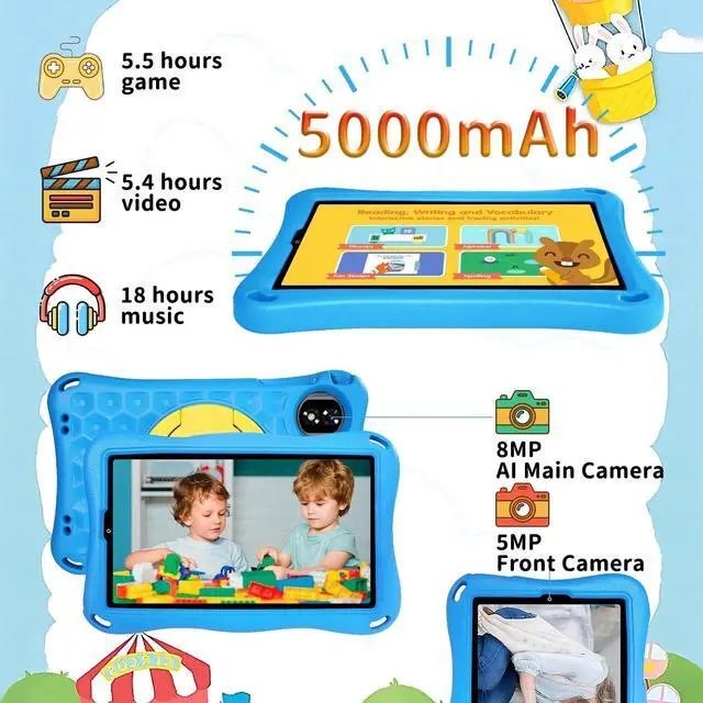 As an Android tablet certified with Widevine L1, it supports HD streaming on Disney+, Prime Video, and YouTube Kidsideal for educational and fun content ^^ High Performance with 12GB RAM + 32GB StorageWith 12GB RAM and 32GB expandable storage (up to 1TB), this E11 kids tablet ensures smooth performance for learning apps, games, and videos. Its perfect for multitasking and storing everything your child loves while supporting fast operation and longer usage ^^ Long-Lasting 5000mAh Battery & Wi-Fi 6Equipped with a 5000mAh battery, this Android tablet offers extended use for all-day learning.