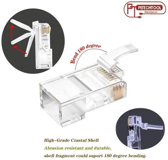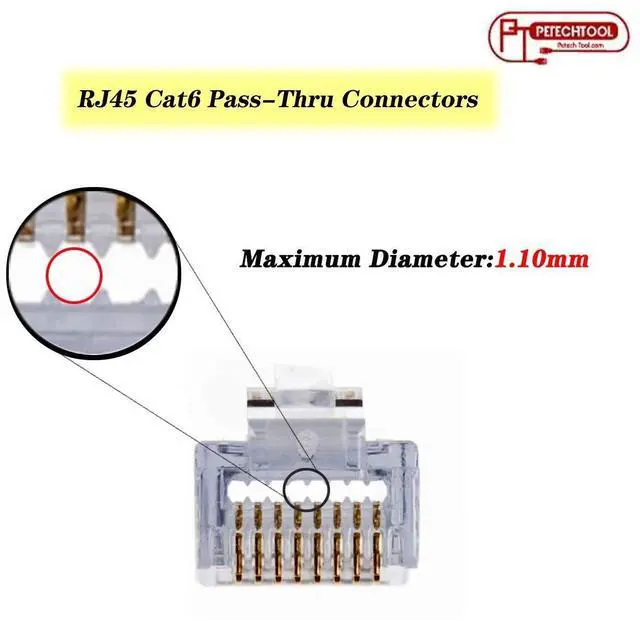 RJ45 CAT6 CAT5 CONNECTORS not only let you make enternet cables in custom lenths without breaking the bankbut also can work effectively with every model of pass through crimper tool and RJ45 cat5 cat6 connectors for 24AWG cable. (NOTEPlease straighten the wires and cut it neatly in order to Pass Through easier) ^^ PASS-THRU DESIGN allows the wires to pass through the connector so the twists in each pair can be pulled closer to the contacts than conventional plugs. In addition, as wires are inserted through the connector and out the other side, making sequence verification easier.