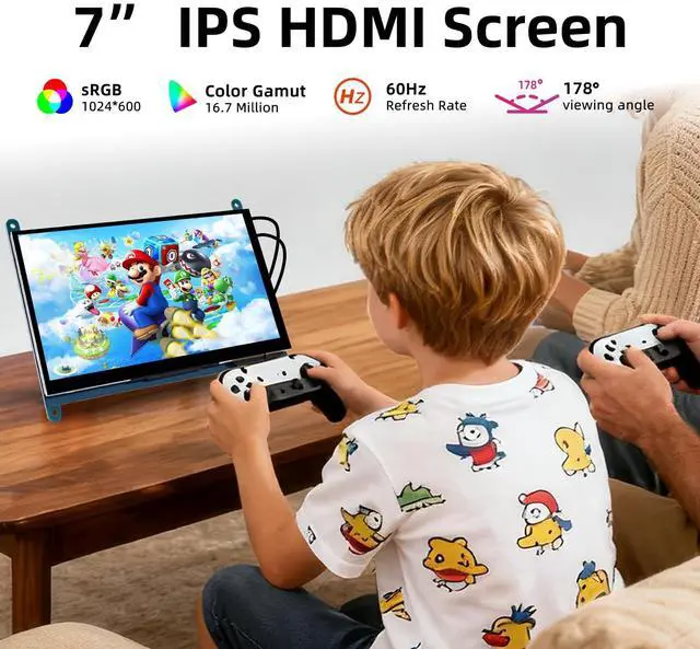 Mini Portable Monitor7 inch IPS screen, 178 wide viewing angle, and support 1024*600 resolution, up to 1920x1080 software configuration resolution. ^^ Plug-n-Play No need to install a driver, connect the device through the HDMI interface and the power supply (USB interface) can be used. ^^ Wide Compatibility Designed for Raspberry Pi (5/4/3/2/Zero W), it is compatible with a variety of mini computers, game consoles (NS/XBOX/PS4, not for PS5), notebook computers, TV boxes and other devices and a variety of operating systems. ^^ 3-in-1 Display Modesduplicate mode, extend mode and second screen mode.