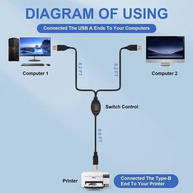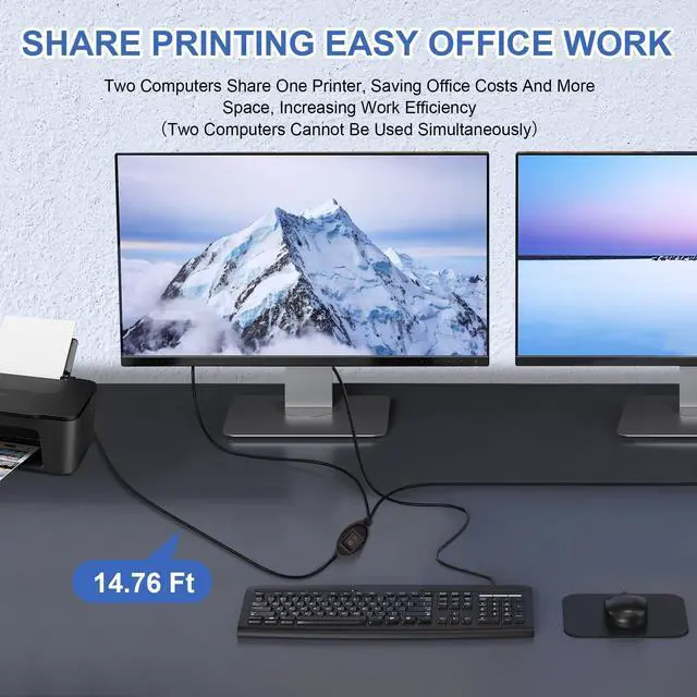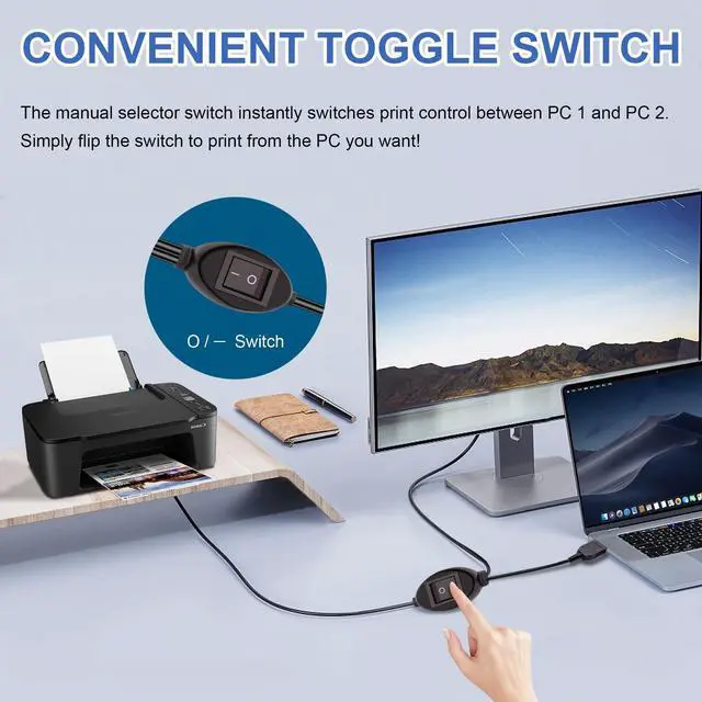 Easily Share Your PrinterThis USB printer splitter is the perfect solution for 2 computers to share 1 USB printer or scanner. Simply connect the USB B end to your printer and the two USB A ends to each computer. No more tedious plugging and unplugging! ^^ Convenient Toggle SwitchFeatures a manual selector switch to instantly change printing control between PC 1 and PC 2. The 1-in-2-out design ensures stable data transmission and prevents signal conflicts. Just flip the switch to print from the computer you want! ^^ Wide Compatibility & Plug and PlayThis USB B splitter is universally compatible with most inkjet/laser printers, scanners, and other USB-B devices.