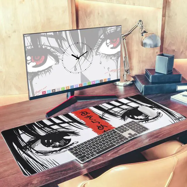^^ Design: Japanese Manga Eyes Desk Mat The expressive anime-style illustration with symbolic kanji text makes this mouse pad a standout choice for manga fans, graphic design lovers, and modern desktop aesthetics.