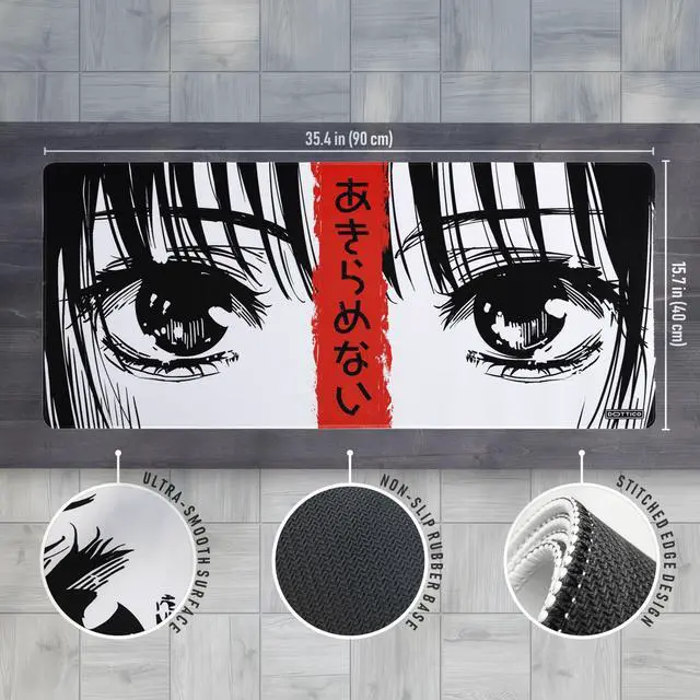 Quality: Minimalist Manga Eyes Design Featuring a high-contrast black-and-white manga-style close-up with bold linework and a red kanji stripe reading Never Give Up, this mat brings a unique visual identity to your workspace.