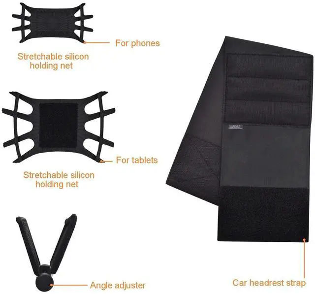 PACKAGE - Pack includes Headrest Strap, silicon Phone Holding Net , Tablet Holding Net, detachable Angle Adjuster.