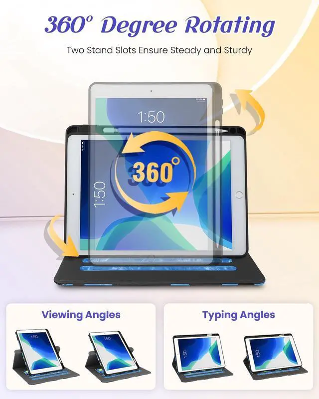 Rotating Stand: This for iPad 9th/8th/7th case with an functional rotating stand design, supporting your devices to switch between landscape and portrait orientations. While 2 anti-slip strip design allow for multiple horizontal stand angles for comfortable viewing or typing ^^