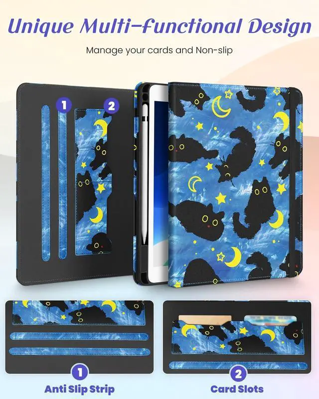 Multi-Functional Design: This for iPad case 9th generation/8th generation/7th generation features an elasticized cord strap, which ensures that your tablet closes securely, provides slip or drop protection. It also has two card slots designed to hold your bank cards business cards and other cards