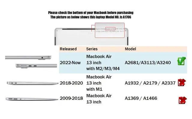 Models: A3240 (M4 2025) /A3113 (M3 2024) /A2681 (M2 2022). Verify "A1xxx" on device underside before purchase. ^^ NOT compatible with MacBook Air 13.3 Inch M1 Model A2337/A1932/A2179(2018-2020 Ver. ) nor Macbook Air 13 inch( 13.3 ) Model A1369/A1466 Old Version 2010-2017. ^^ High Quality Hard Shell Case for original touch protect your MacBook, strong and durable material against shock, scratch, fingerprint, dusty and other damage, thin and light design will not increase excess volume. ^^ Easy to put on and take off and Plug your charger, cable or headset without removing the protective case. Air-follow through ventilation areas for heat release, Rubberized feet to keep your MacBook firmly in place ^^ 2 in 1
