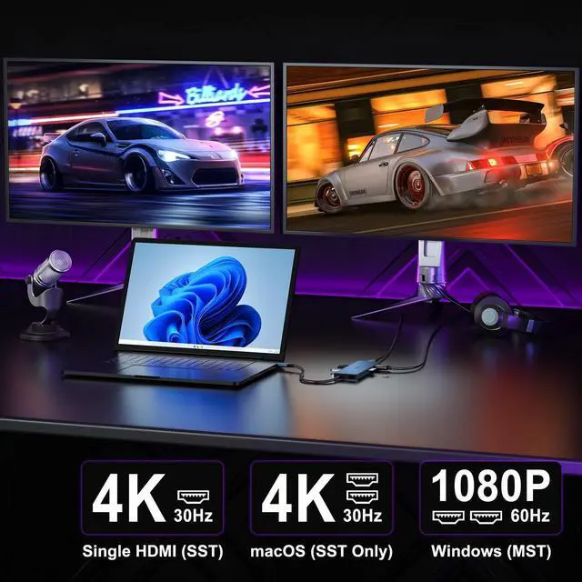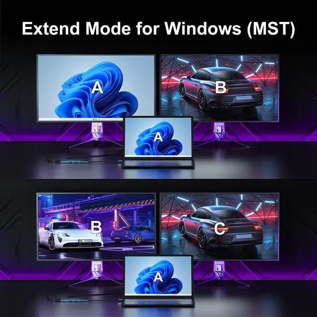 Windows support: AAA, ABB, AAB, ABC mode ^^ Dual HDMI Docking Station 4KSingle display: up to 4K@30Hz. In MST mode, dual