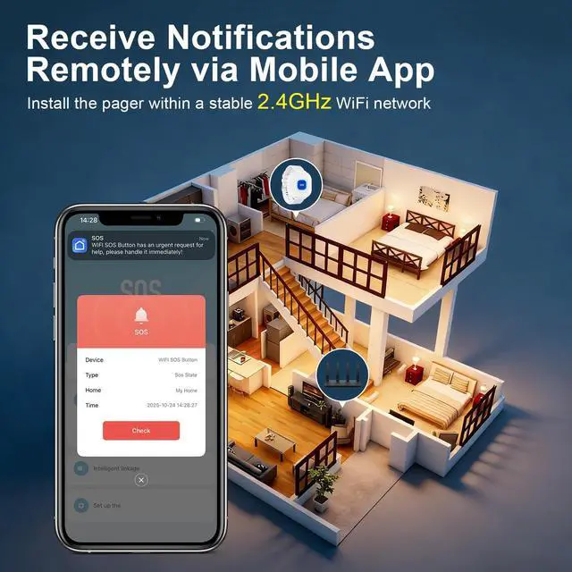 Wi-Fi Only: The elderly call device requires a constant connection to a paired 2.4GH z Wi-Fi network to function and is not suitable for outdoor use. The paired mobile phone only needs internet access; even when away, it will receive alarm notifications from the Wi-Fi call device.