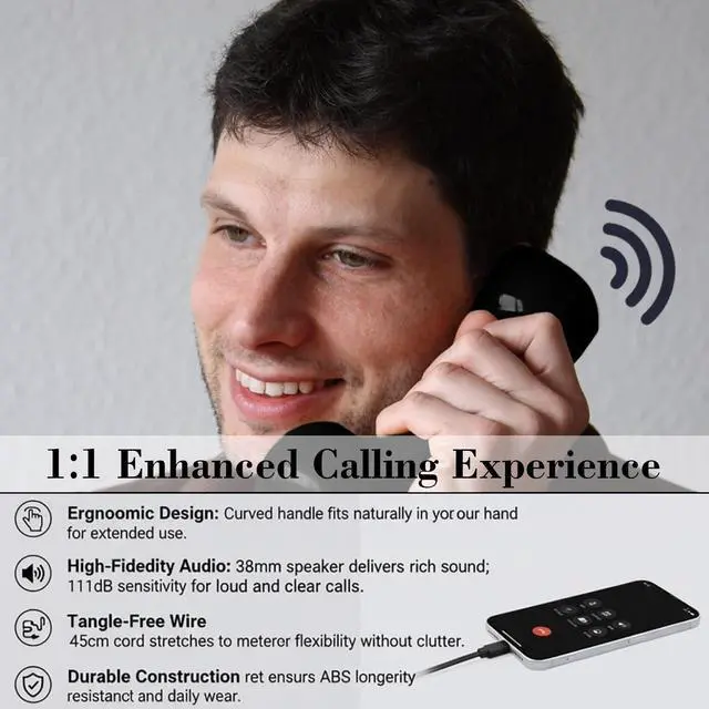 ^^ Instant Setup & Extended Reach - Enjoy true plug-and-play convenience. Just connect the handset to your deviceno complex setup required. The included 3.3 ft / (1m) cable gives you the freedom to move comfortably while you talk, making it the perfect everyday telephone receiver for your cell phone. ^^ Crystal-Clear Audio - Immerse yourself in conversations with a high-definition speaker and sensitive microphone. This duo works together to deliver rich, detailed sound, ensuring you hear and are heard perfectly, while maintaining a natural and comfortable volume even during long calls.
