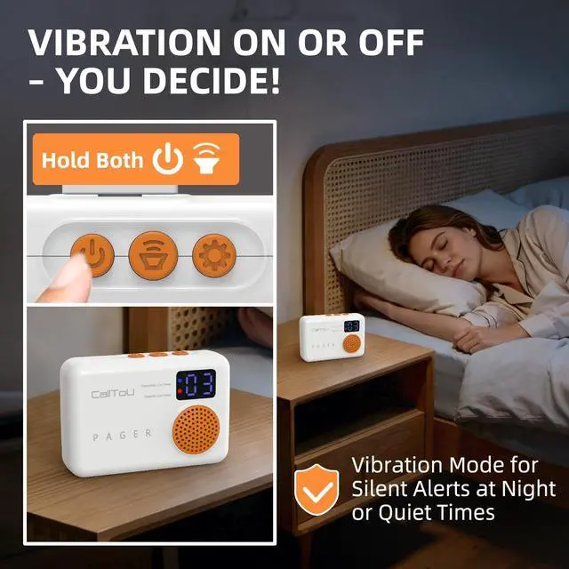 SMART & ADJUSTABLE ALERTS: The portable receiver doubles as a powerful call bell, featuring strong vibration and 5 adjustable volume levels (0-120dB) with two alert ringtones (Ding-Dong / Alarm). Youll always notice the call, whether in a quiet room or a busy environment. ^^ EASY TO CARRY & NO MONTHLY FEES: Designed for homes and small care units. With its belt clip and 500+ feet range, the receiver goes wherever the caregiver does. Enjoy complete freedom with no monthly fees. ^^ EXPANDABLE SYSTEM SUPPORTS 20