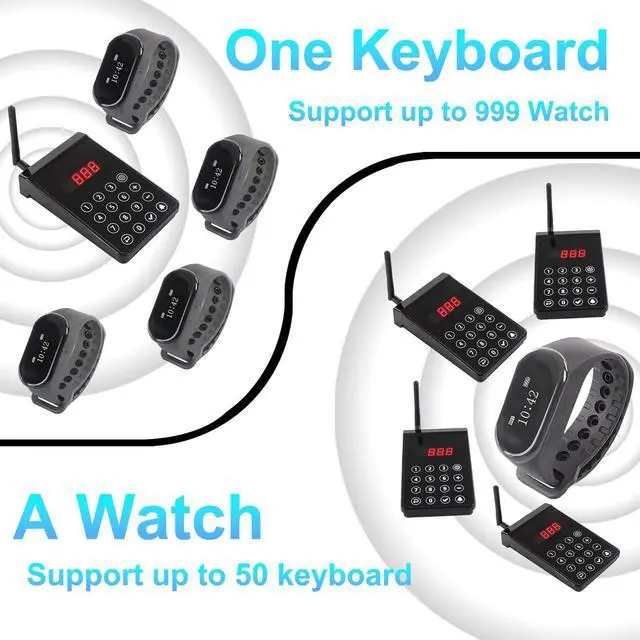 Scalable Design: The system features 1 keyboard transmitter and 5 wirst watch pagers. The system can support up to 999 watch receivers, 50 keyboard transmitter and 500 call buzzer pager, expanding as your staff grows without wasting equipment.