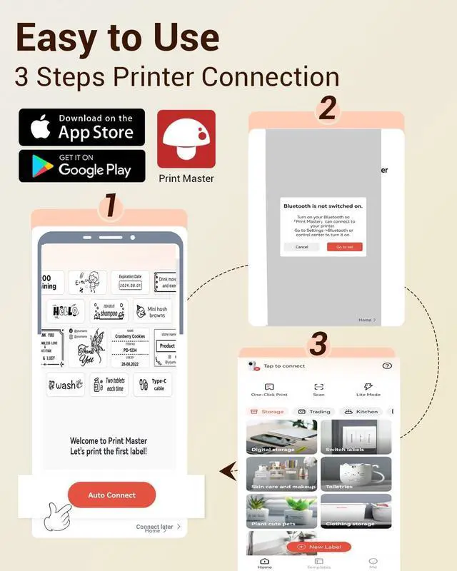 Support System: for IOS 9.0 + Android 5.0 and above. You can easily take it anywhere and enjoy printing ^^ Using smart app-Print Master app are powerful and easy to use. It offers variety of fonts, various texts, qr code, barcode, logo, symbols and icons. ^^