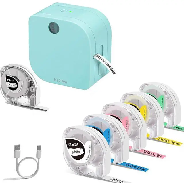 Label Maker Machine with 6 Tapes: 1x P12 PRO Label Maker Machine, 2x Black on White P12 Label Tape(12mm X 4m), 4x Colored Label Tape (Blue/Pink/Yellow/Green)(12mmX 4m), 1X USB-Charging Cable