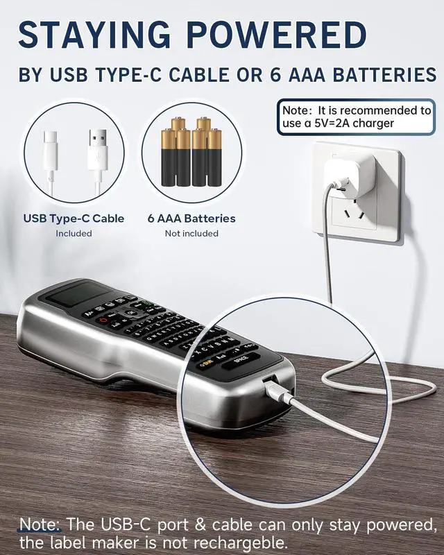 Power Supply Modes: E1000 label maker machine with tape work with USB C cable (Package Included) to stay powered, it offers enhanced convenience compared to the traditional AC adapter. E1000 label maker machine can also work with 6 AAA batteries (Package Not Included) ^^ Featuring Chain Print to