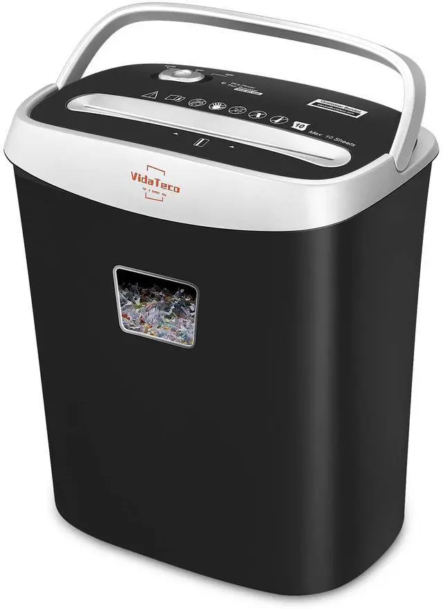 Security level: This crosscut paper shredder takes max 10-sheet of 20-pound bond paper down to 0.16 inches by 1.4 inches (4 by 36 mm) at a time, no need to remove staples or clips. Also shreds credit card, CD, junk mail (one at a time) ^^