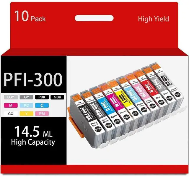 This Item Includes: 10 Pack PFI-300 MBK PBK C M Y PM PC R GY CO Ink Cartridges